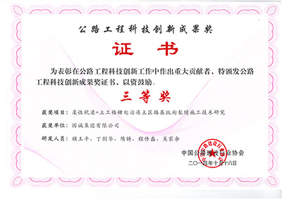 近日,中國公路建設(shè)行業(yè)協(xié)會組織開展了2014年度公路工程科技創(chuàng)新成果申報評審鑒定和評獎工作,經(jīng)過查新、申報、答辯、評審后,國誠集團(tuán)有限公司以《柔性枕梁+土木格柵處治凍土區(qū)路基縱向裂縫施工技術(shù)研究》榮獲公路工程科技創(chuàng)新成果獎三等獎。