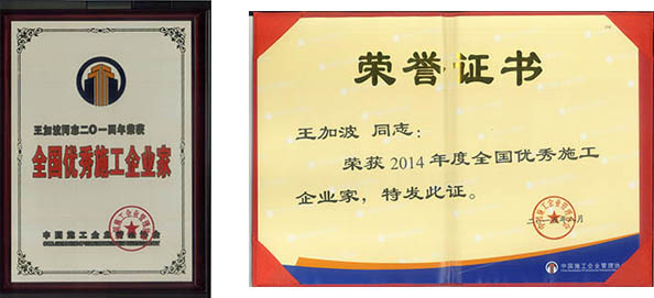 2015年9月17日,中國施工企業(yè)管理協(xié)會在北京召開“2015年全國施工企業(yè)領(lǐng)軍人物峰會”,在會上,集團董事長王加波被授予 “全國優(yōu)秀施工企業(yè)家”榮譽稱號。