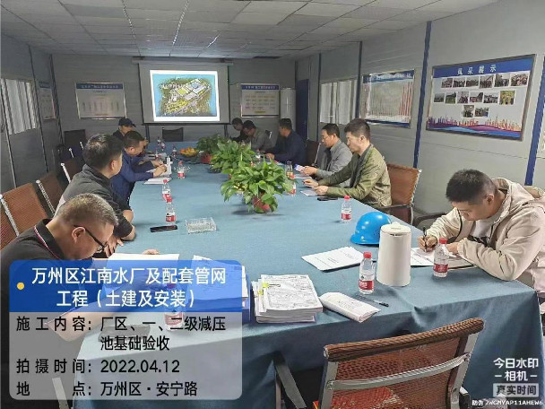2022年4月12日由集團(tuán)公司承建的萬(wàn)州區(qū)江南水廠及配套管網(wǎng)工程進(jìn)行了廠區(qū)、一級(jí)、二級(jí)減壓池基礎(chǔ)驗(yàn)收,業(yè)主單位重慶長(zhǎng)江水務(wù)集團(tuán)有限公司對(duì)我公司的施工組織、施工進(jìn)度、施工質(zhì)量給予了高度評(píng)價(jià)和認(rèn)可。
