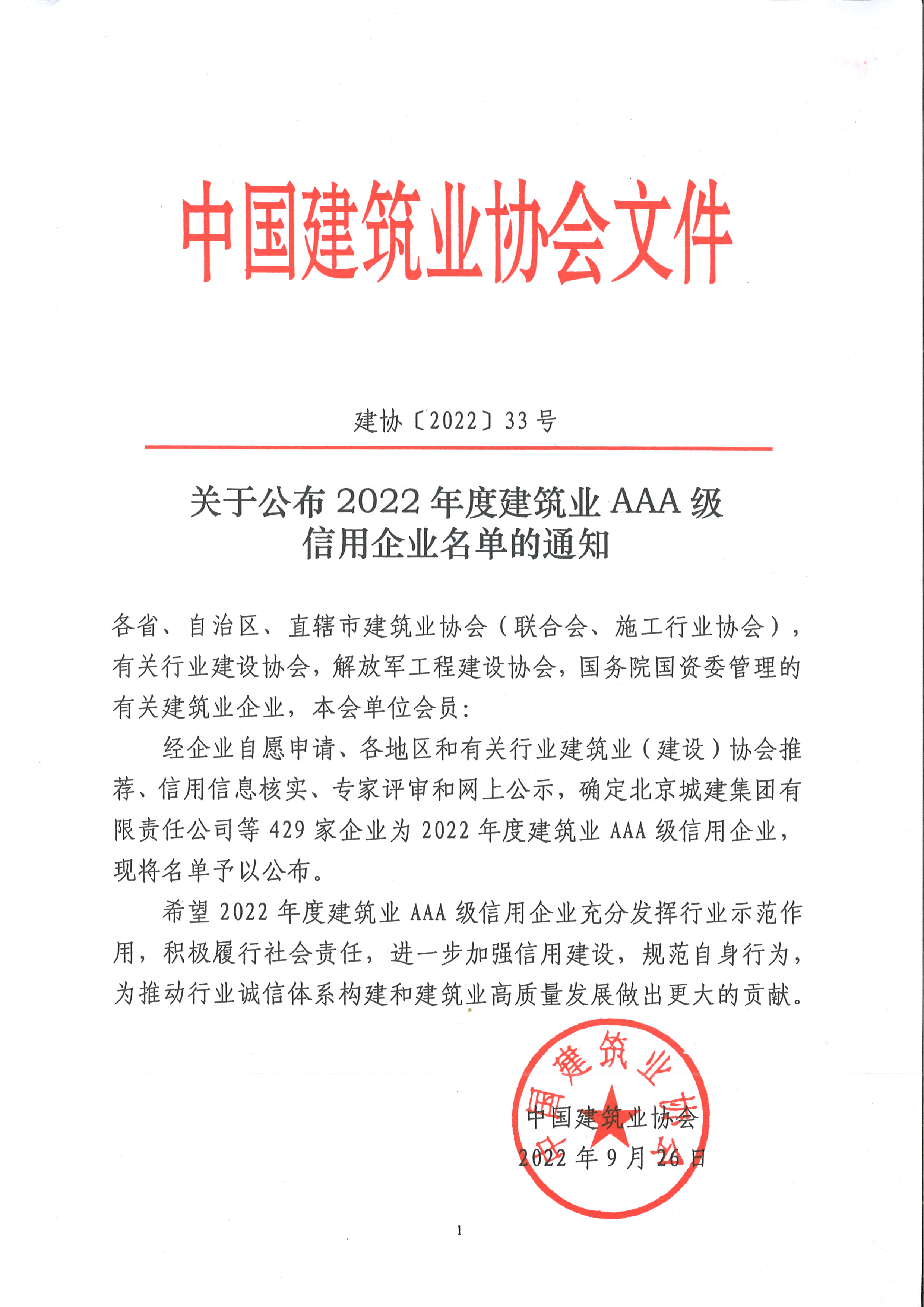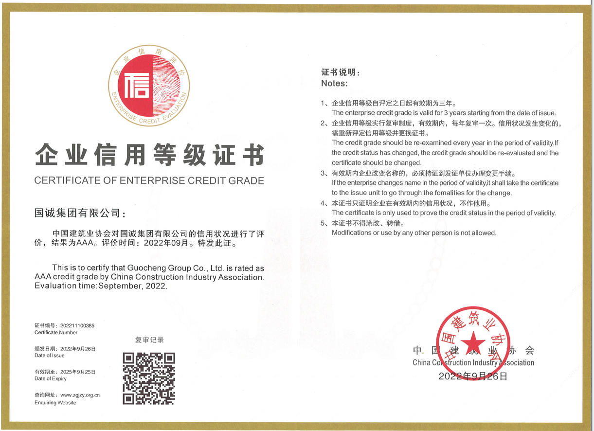 國誠集團(tuán)榮獲2022年度建筑業(yè)AAA級信用企業(yè)稱號