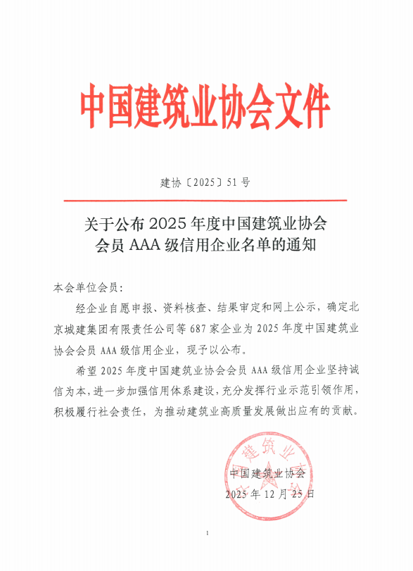 12月25日,中國建筑業(yè)協(xié)會發(fā)布《關(guān)于公布2025年度中國建筑業(yè)協(xié)會會員AAA級信用企業(yè)名單的通知》(建協(xié)〔2025〕51號),集團(tuán)公司憑借規(guī)范的經(jīng)營管理、良好的履約能力和卓越的行業(yè)口碑,順利通過AAA級信用企業(yè)復(fù)評,再次斬獲這一建筑業(yè)信用領(lǐng)域的最高榮譽。