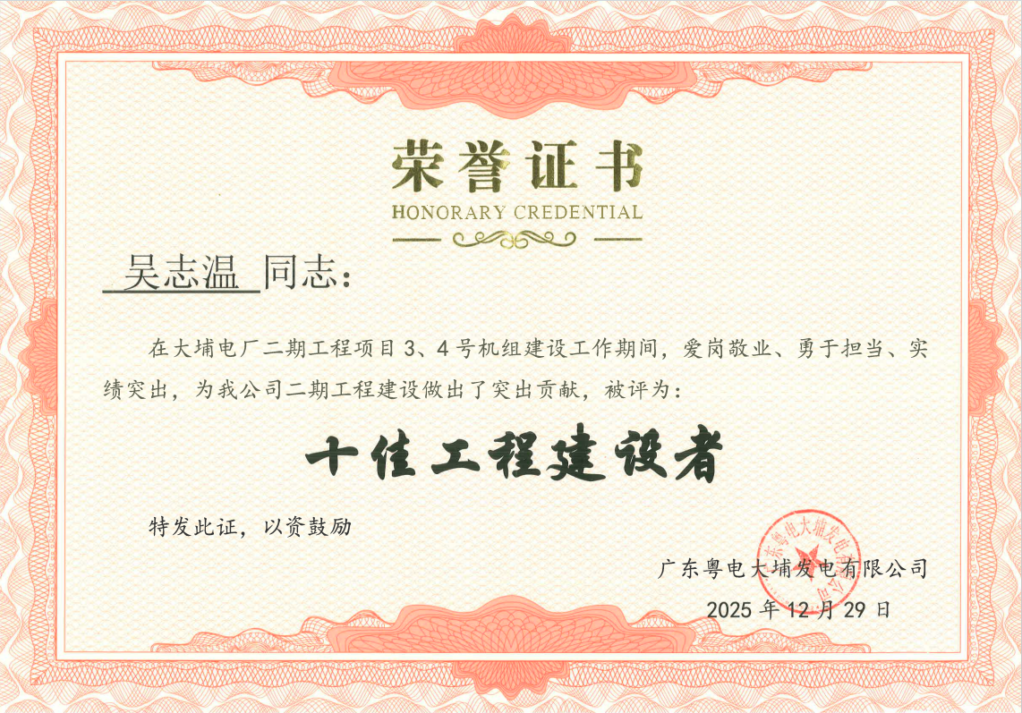 2025年12月29日,廣東粵電大埔發(fā)電有限公司“十佳工程建設者”評選結果揭曉,國誠集團有限公司承建的廣東粵電大埔電廠二期工程6號地塊邊坡治理施工項目部項目經理吳志溫成功入選。這份榮譽不僅是對個人工作的高度肯定,更是業(yè)主單位對我司工程建設水平、項目管理能力與優(yōu)質服務品質的充分認可。